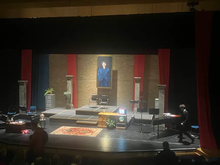 Second, the stage was really excellently designed. Big props to Livia Bell and Charlotte Crawley. (Picture below). It was spacious, made good use of levels, worked for more or less every scene. The portrait of Nero watching over everything felt apt and beautifully done, and I just couldn’t be a bigger fan of the set design. Costumes too were utterly perfect for every single character, major and minor. They never detracted, only enhanced the overall vision. For that matter, was this show inspired by Megalopolis? I was on the fence. Sometimes it felt like it was interested in Francis Ford Coppola’s fusion of Ancient Roman politics with modernity & the future, his blending of corporate elites and dynasties, love and sex and intrigue. The paparazzi. The flashing cameras. It did all feel kind of Megalopolis. Which, I get it…this is a bit of a Megalopolis kind of opera.